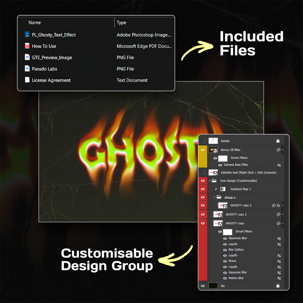 Crafted inside the Labs to explore glow, tension and soft distortion. This layered text effect brings a ghosted tone and hazy presence to your type. Designed for titles, posters and covers — it's fully editable, layout-ready and easy to customise with your own text.